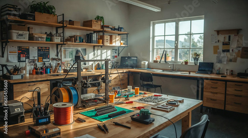 A well-lit workshop with a 3D printer, spools of filament, tools, and various components organized on wooden workbenches and shelves.