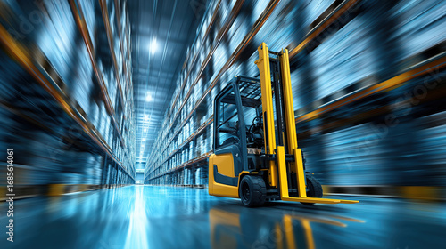 Warehouse forklift navigates narrow aisles in a bustling storage facility