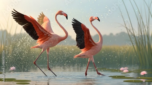 Pair of flamingos dancing in shallow water, synchronized wing stretch, droplets sparkling in the air like tiny jewels