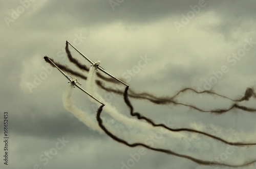 Wieczorny pokaz lotnictwa, samoloty w szyku, na niebie ślady dymu.