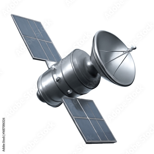 Satelita kosmiczna ze srebrną anteną i panelami słonecznymi — symbol łączności, nawigacji i technologii orbitalnej