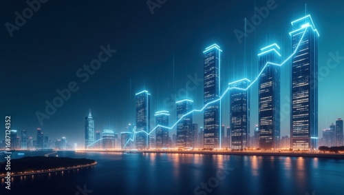 Gráfico de crecimiento financiero en ascenso con fondo de horizonte de ciudad futurista, rascacielos brillantes que representan el progreso económico