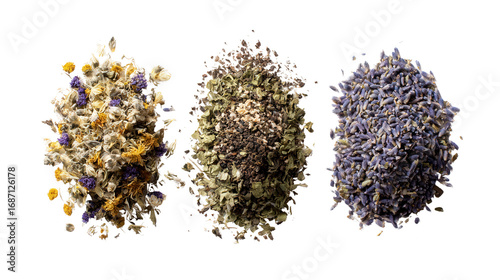 Premium Herbal Tea Blends: A flat lay of premium herbal tea blends like chamomile, peppermint, and lavender, isolated on a Transparent background, PNG file.