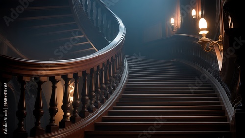 Grandeur Ascending A Majestic Staircase Reveals Opulence, Wood Grain, and Architectural Elegance Radiating Warmth Amidst Gentle Illumination, Inviting Exploration and Evoking Timeless Sophistication