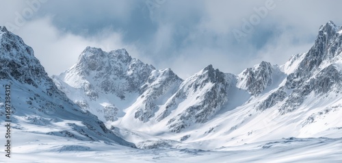The breathtaking snowy mountains under a dramatic sky capture nature's serene beauty.