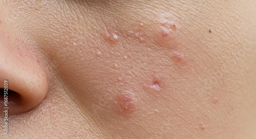 Closeup shows skin irritation with tiny bumpsblisters on the cheek near a nose