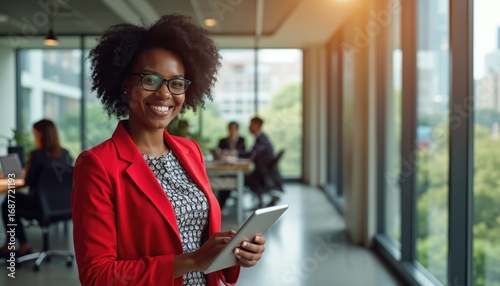 Confident pro woman in red blazer smiles holding tablet. Diverse team works in modern office background. Businesswoman interacts with tech, focusing on teamwork and innovation.