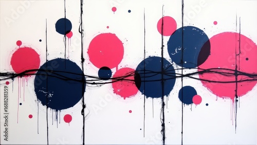 Abstract painting featuring overlapping dark-blue and bright-pink circles, connected by thin black lines and drips on a white background.