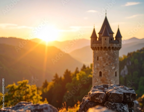 Średniowieczny stary zamek na wzgórzu o zachodzie słońca