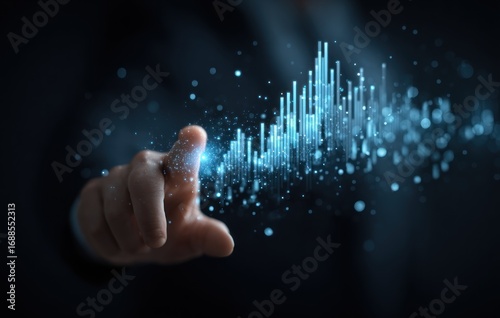 Finger touching a rising data graph, surrounded by glowing specks, against a blurred dark background