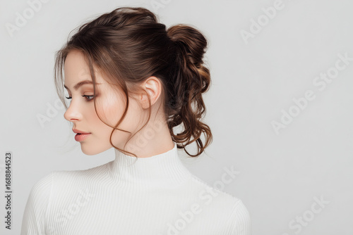 Trendy girl’s hairstyle, neat ponytail with subtle volume, minimal yet fashionable, refined edges and graceful look, modern aesthetic