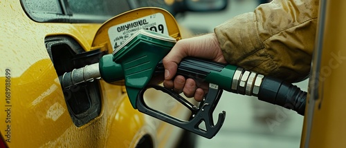 Close-up of hand holding fuel nozzle filling yellow car on rainy day