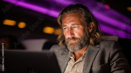 A middle-aged Caucasian man with long hair and a beard works on a laptop in a sleeper train cabin. Soft purple lighting creates a cozy atmosphere for night travel.