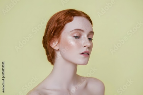 Beautiful redhead woman with freckles studio profile portrait.