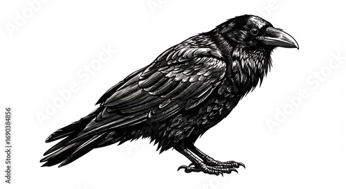 精緻な墨絵風 カラス 羽根模様 鮮やかに描写 白背景. AI Generated