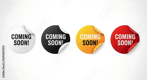 Exciting coming soon sticker set announces product launch, promotion, or website updates with eye-catching designs and vibrant colors