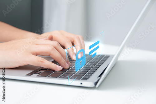 Hands typing on laptop keyboard to log in to a system. Concept of online security, password access, authentication, digital technology, and data protection