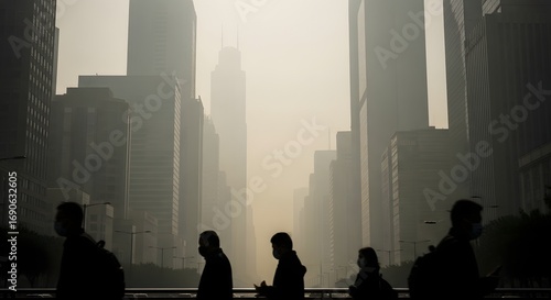 Cityscape Silhouette People Walking Amidst Skyscrapers in Hazy Sunlight.