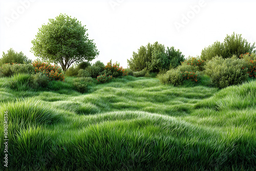 Falisty, naturalny trawnik z wysoką trawą. W tle znajdują się drzewa i krzewy z pomarańczowymi kwiatami.