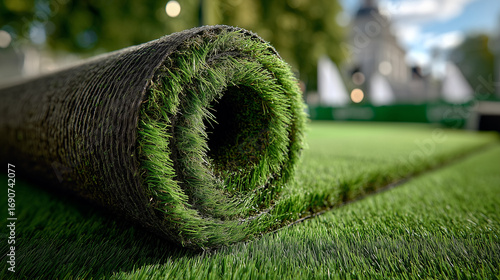 Zbliżenie na dużą, rozwijaną rolkę sztucznego trawnika, który jest instalowany na otwartym, zielonym terenie z niewyraźnym tłem.