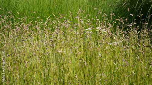 natural image of mosquito grass (bouteloua gracilis) and a few garlic chives plants (Allium tuberosum ) during summertime