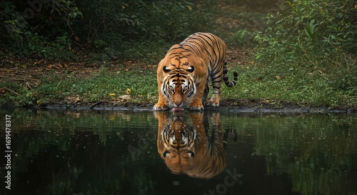A majestic tiger drinks from a pool of water in the lush green forest, its reflection shimmering on the surface of the water