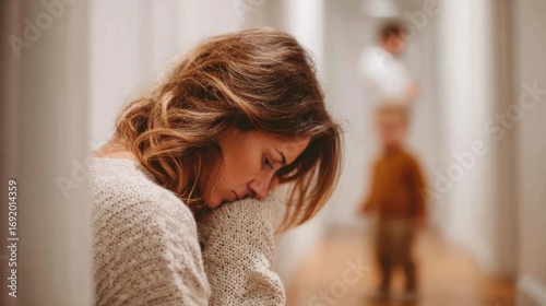 Single mother quietly crying while her child plays in a hallway during an emotional moment at home