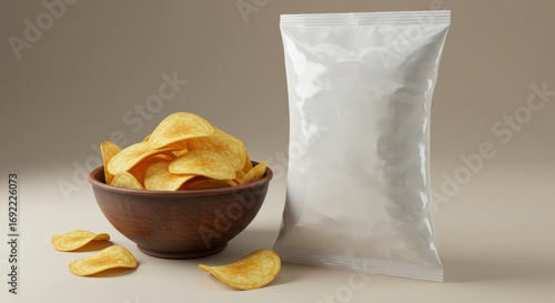Potato chips in bowl next to bag on neutral background