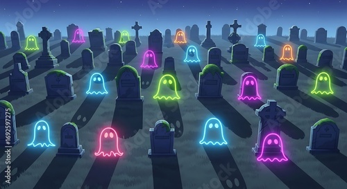 Spectral gathering a luminous graveyard tableau with vibrant neon apparitions under a starlit evening sky