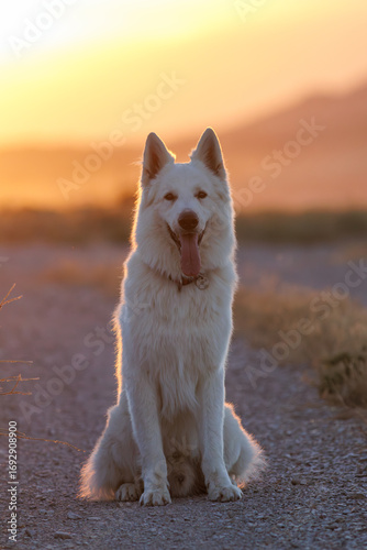 PERRO PASTOR BLANCO SUIZO CON PUESTA DE SOL