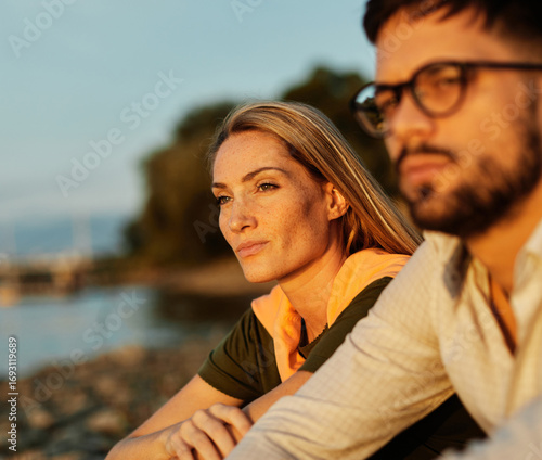 Portrait of a young happy couple having fun outdoors in nature during sunset. Girlfriend and boyfriend bonding, love concept during summer.