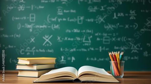 Math Education Still Life: Open Textbook, Chalkboard with Equations, and Pencils - Learning & Academic Concepts
