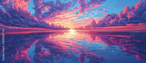 Fluffy pink and purple sunset clouds mirrored flawlessly on wide expanse of wet beach sand at low tide creating stunning symmetrical coastal beauty nature