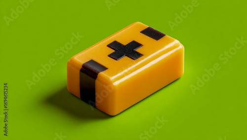 Bright orange battery with black plus and minus symbols on a vibrant green background