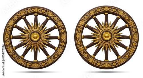 Two golden dharma wheels with intricate details on a white background