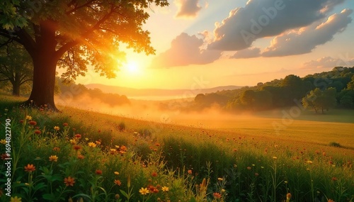 Golden hour sunlight bathes a serene landscape, embodying perfect peace and contentment A feeling of utter bliss washes over the scene, representing complete happiness , mountains, idyllic