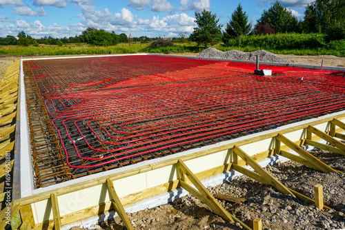 Insulated house foundation with underfloor heating pipes and reinforcement at construction site