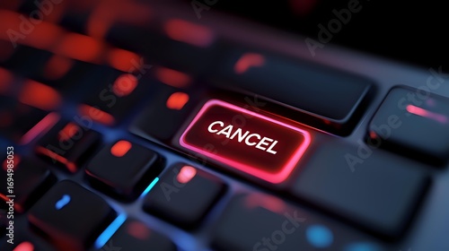 Glowing red cancel button on black computer keyboard with dramatic lighting and shallow depth of field, modern technology concept for digital interfaces.