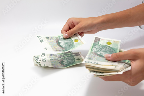 Polskie pieniądze, banknoty w kobiecych dłoniach na białym tle