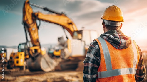 Construction worker surveys site with heavy machinery in golden hour sunlight, ready for action.