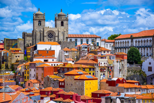 View over the old town of Porto, Portugal with the cathedral and colorful buildings