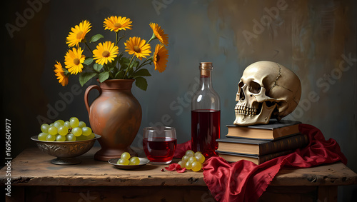 A memento mori still life featuring vibrant yellow flowers, ripe grapes, a bottle of wine, and a skull atop old books on a rustic table