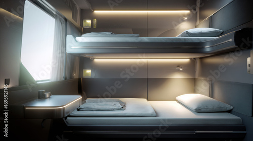 Modern train sleeper cabin with bunk beds and ambient lighting