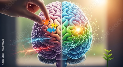 A conceptual look at brain function, contrasting the logical left hemisphere with puzzle pieces against the vibrant, creative right hemisphere