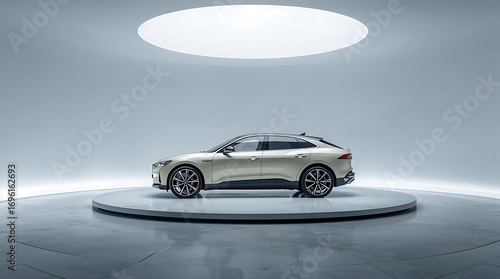 A sleek, modern car showroom with a new model on a rotating platform, bathed in a soft, ethereal light.