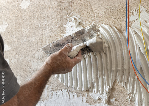 Craftsman spreads tile adhesive with trowel on a house wall, hand closeup. Construction process