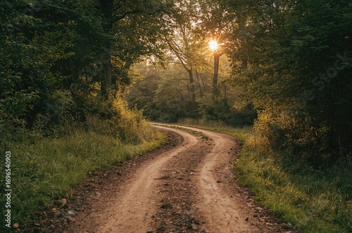 Dirt path bathed in the glow of the late afternoon sun in the countryside