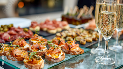 Elegant canapés and champagne flutes ready for a party or event, creating a sense of luxury and celebration. Toast the good times!