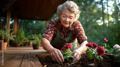 An elderly woman with glasses tends to colorful flowers in her garden, showcasing the beauty of nature and the joy of nurturing plants during a sunny afternoon.