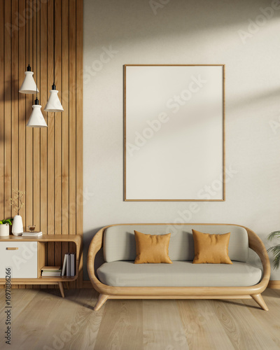 Blank frame hanging on white wall over wooden sofa on parquet floor in sunlit room of modern house.
